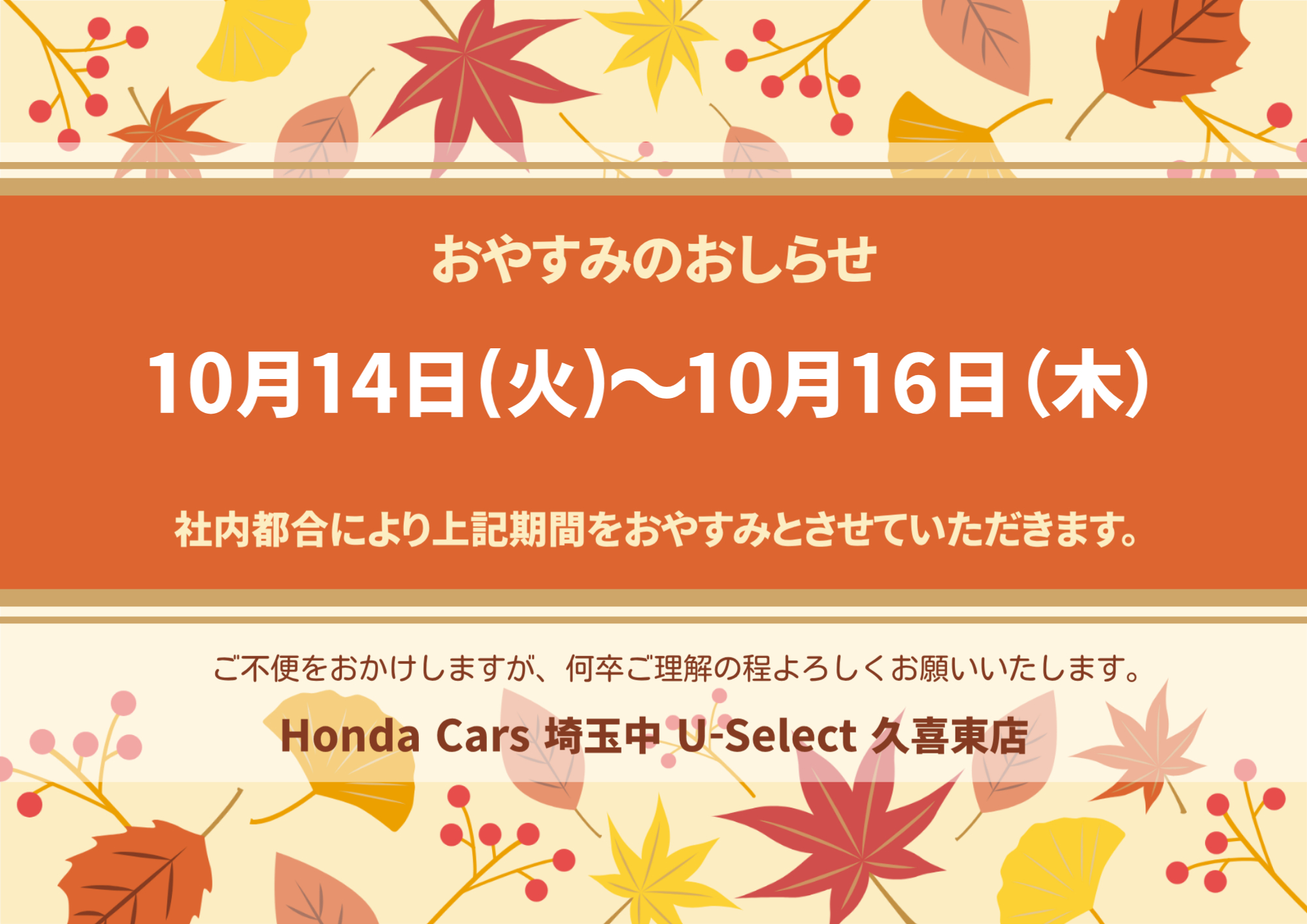 社内都合により14日〜16日は全店休業日となりますのでご了承ください。