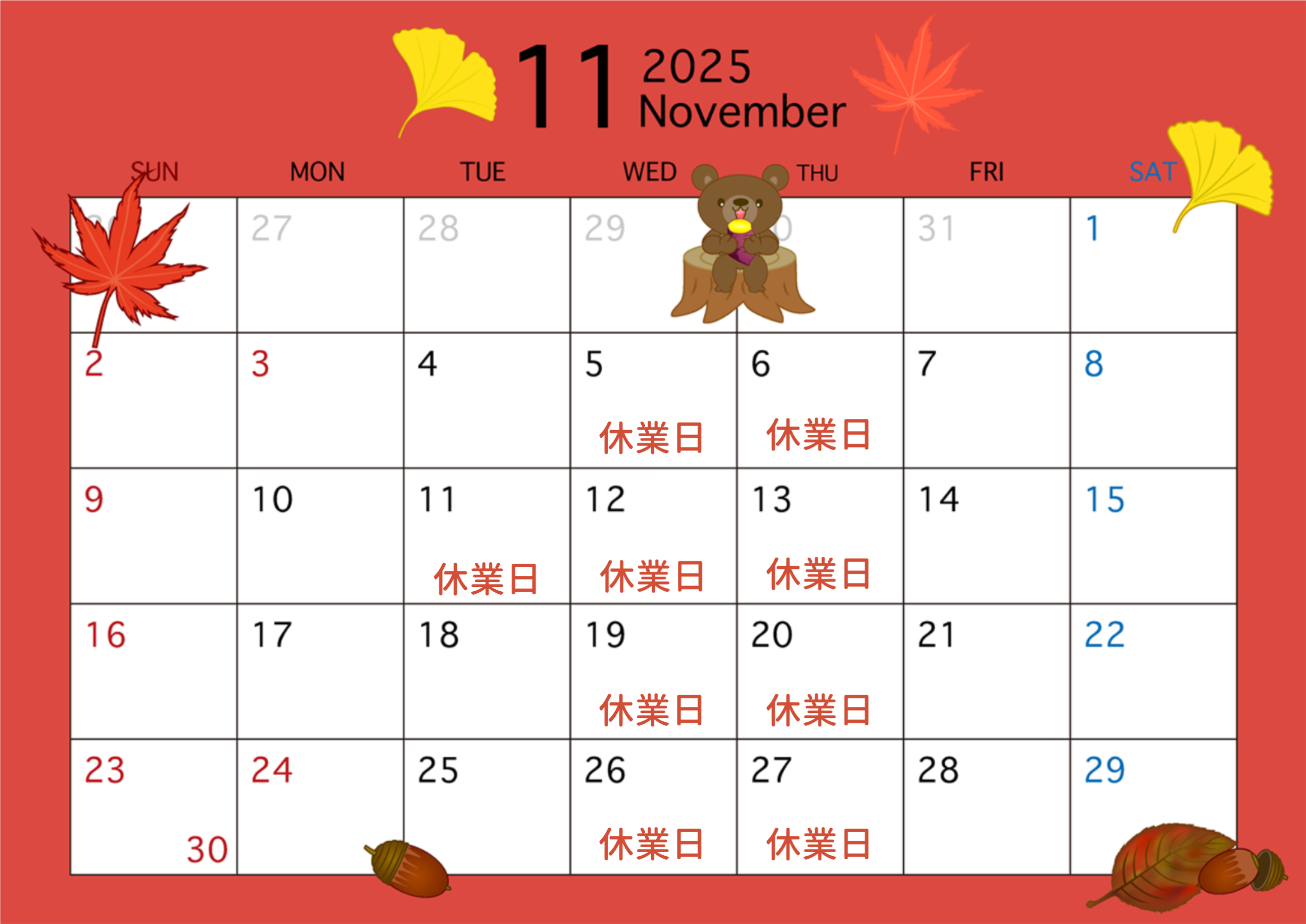 11月のお休みは、水曜日・木曜日の他、11日(火)がお休みとなりますのでご了承ください。