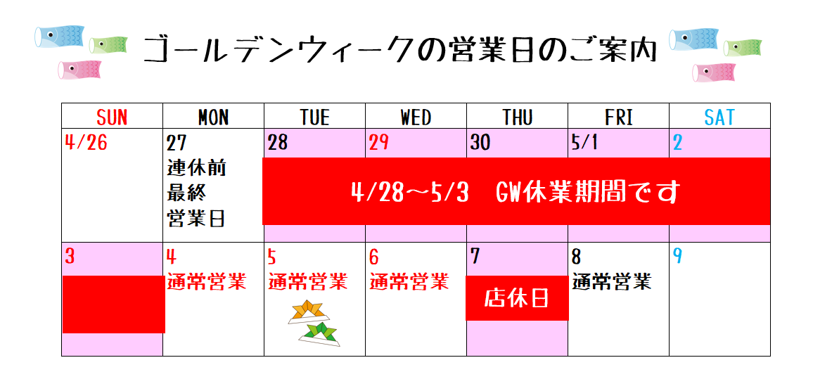 今年はゴールデンウィークの後半は通常営業致します🎏