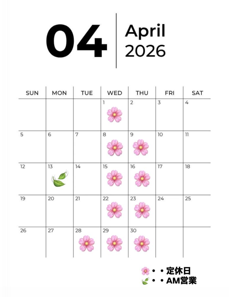 いつも当店のブログをご覧いただきありがとうございます。4月定休日のご案内です(*^▽^*)
