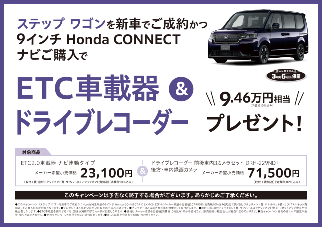 ただいまステップワゴンを新車でご成約かつ、9インチ Honda CONNECTナビのご購入で