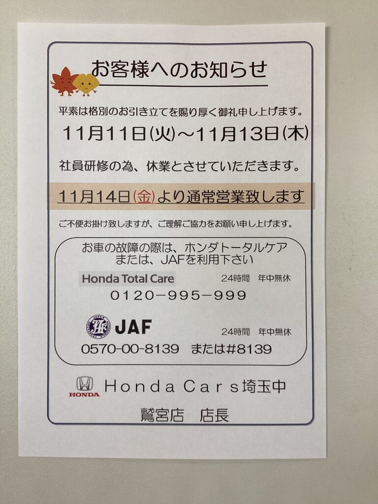 11月11日(火)〜11月13日(木)の3日間は、社内研修の為お休みさせていただきます🙇♀️