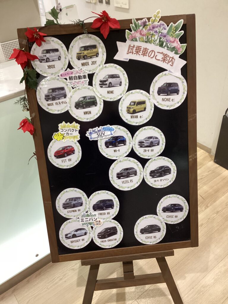 店内には、ただいまご案内中の試乗車のラインナップをまとめたボードを設置しています✨